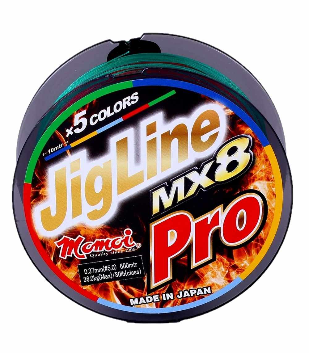 The Momoi JigLine MX8 Pro PE Braided Fishing Line – high-performance 8-strand braided SUPER PE fishing line with MX8 braiding and triple silicon coating. Durable, flexible, and ultra-sensitive with multi-color depth markings (10m × 5 colors). Perfect for jigging and boat fishing. Available in 300m, 600m & 1200m spools, PE0.4–PE6.