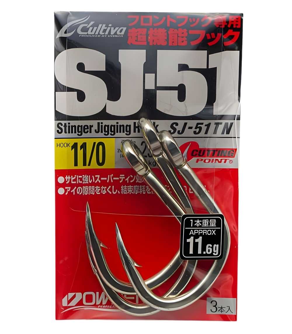 The Owner 11648 SJ-51TN Single Hook Stinger Jigging Hook with reduced barb size, reinforced structure, and TN anti-rust coating. Built for extreme offshore jigging, it delivers deep penetration and outstanding durability for big game species.
