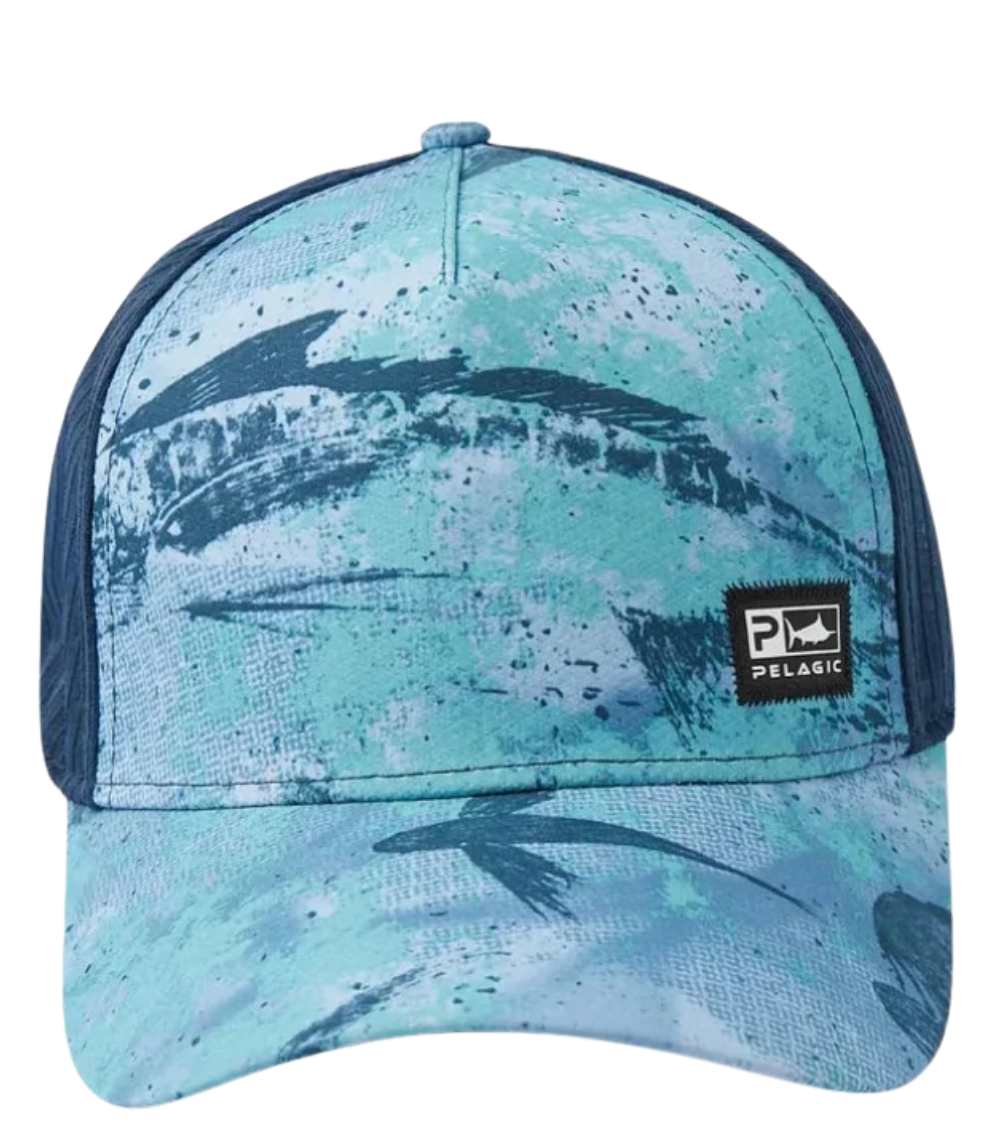 Pelagic Echo Open Seas Performance Trucker Hat is a premium lightweight fishing hat with breathable micro-mesh back panels, water-repellent protection, and a padded perforated headband for cool, dry all-day comfort. Finished with original Gyotaku artwork and an adjustable snapback closure, it delivers technical performance with signature offshore style.