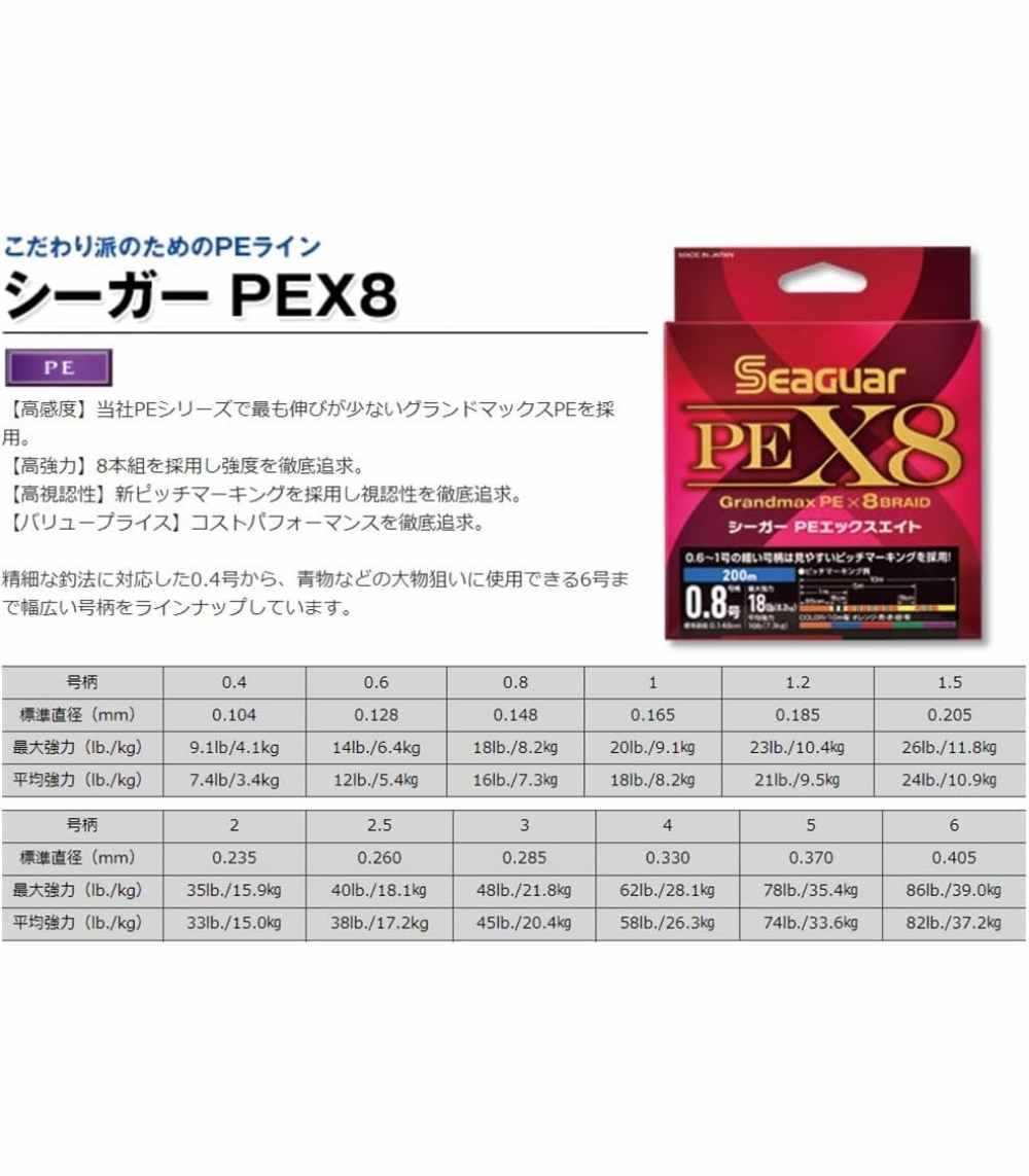 | Seaguar | PE X8 300M #6 | 86 lb | 0.405 mm | PE 6 | 39 kg | 300 m | Multicolor | 8-strand PE |
