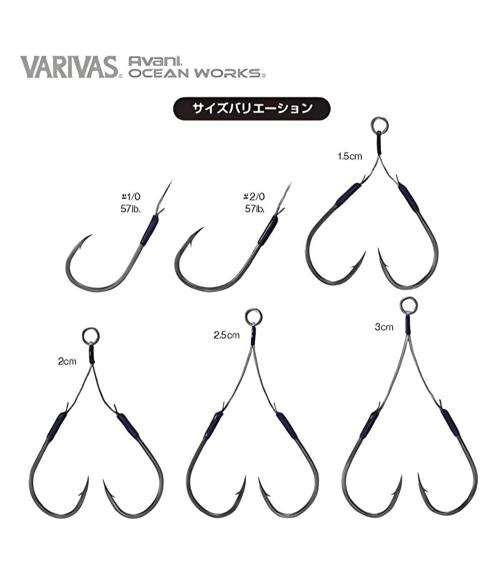 The Varivas AH-62 Ocean Works Twin Assist Light Jig #2/0 (2 cm, 57 lb) – Japanese twin assist hooks with PE assist cord and Zellotion-coated points, engineered for light jigging, slow pitch jigging, and other saltwater jigging applications.