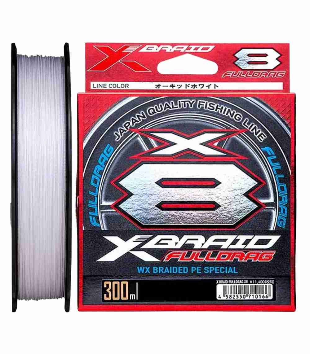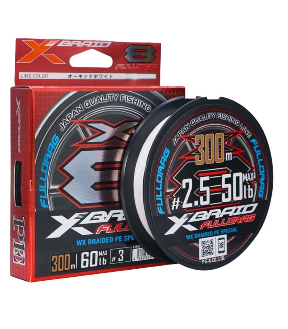 | X-Braid (by YGK) | Full Drag X8 | 300m | #2.5 | 50 lb | Orchid White | PE | 8 |